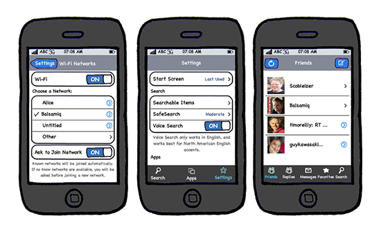 Low Fidelity Prototyp Fokus auf Benutzerführung und Funktionalität weitestgehend losgelöst vom Design UX Mockup Mockup Beispiel: iPhone App, umgesetzt mit Balsamiq Middle-Strong Fidelity Prototyp: Planung der Elemente und Inhalte häufig bereits mit Farben, Bildern und typegrafischen Elementen